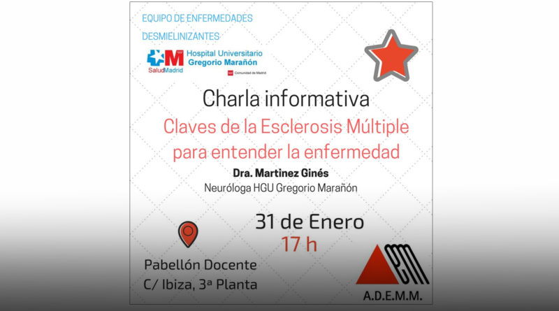 El próximo día 31 de enero a las 17.00 h. tendrá lugar en el Pabellón Docente del Hospital Gregorio Marañón, c/ Ibiza, 3º Planta, la Charla: Claves de la Esclerosis Múltiple para entender la enfermedad.