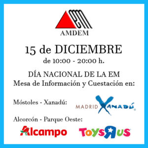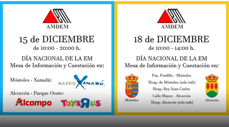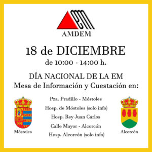 En estos días se redoblan los esfuerzos por dar visibilidad a los afectados por Esclerosis Múltiple y concienciar a la sociedad. AMDEM estará los días 15 y 18 con mesas informativas y petitorias en diferentes puntos de Móstoles y Alcorcón: